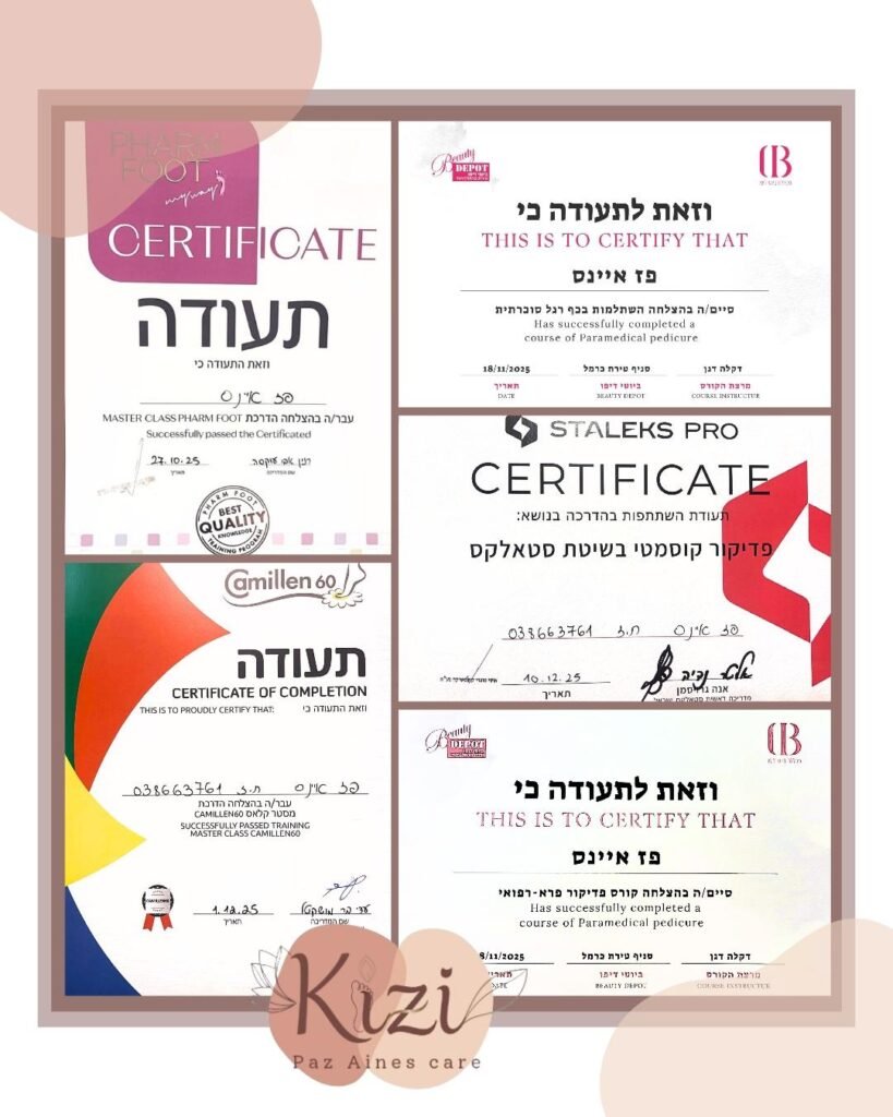 KIZI care by paz aines הוא קליניקה מקצועית לפדיקור פרא-רפואי, טיפולי ואסתטי, המתמחה בטיפול מתקדם בבעיות בכף הרגל ובציפורניים. בקליניקה ניתן מענה מקצועי למצבים כמו יבלות, ציפורן חודרנית ופטרת הציפורן, תוך הקפדה על סטריליזציה ברמה גבוהה במיוחד וסטנדרטים מקצועיים מחמירים. הטיפולים מתבצעים בגישה טיפולית מדויקת ואחראית, המשלבת ניסיון מקצועי, אבחון יסודי והתאמה אישית לכל מטופל. הקליניקה מעניקה טיפולים לנשים, גברים וילדים, כולל טיפול מותאם גם לסוכרתיים, תוך שמירה על בטיחות מלאה ושימוש בשיטות עבודה מתקדמות וללא שימוש בסכין. המטרה היא לא רק לטפל בבעיה קיימת, אלא גם לשקם את כף הרגל והציפורניים, לשמור על בריאותן לאורך זמן ולהעניק תחושת נוחות, אסתטיקה וביטחון בכל צעד.